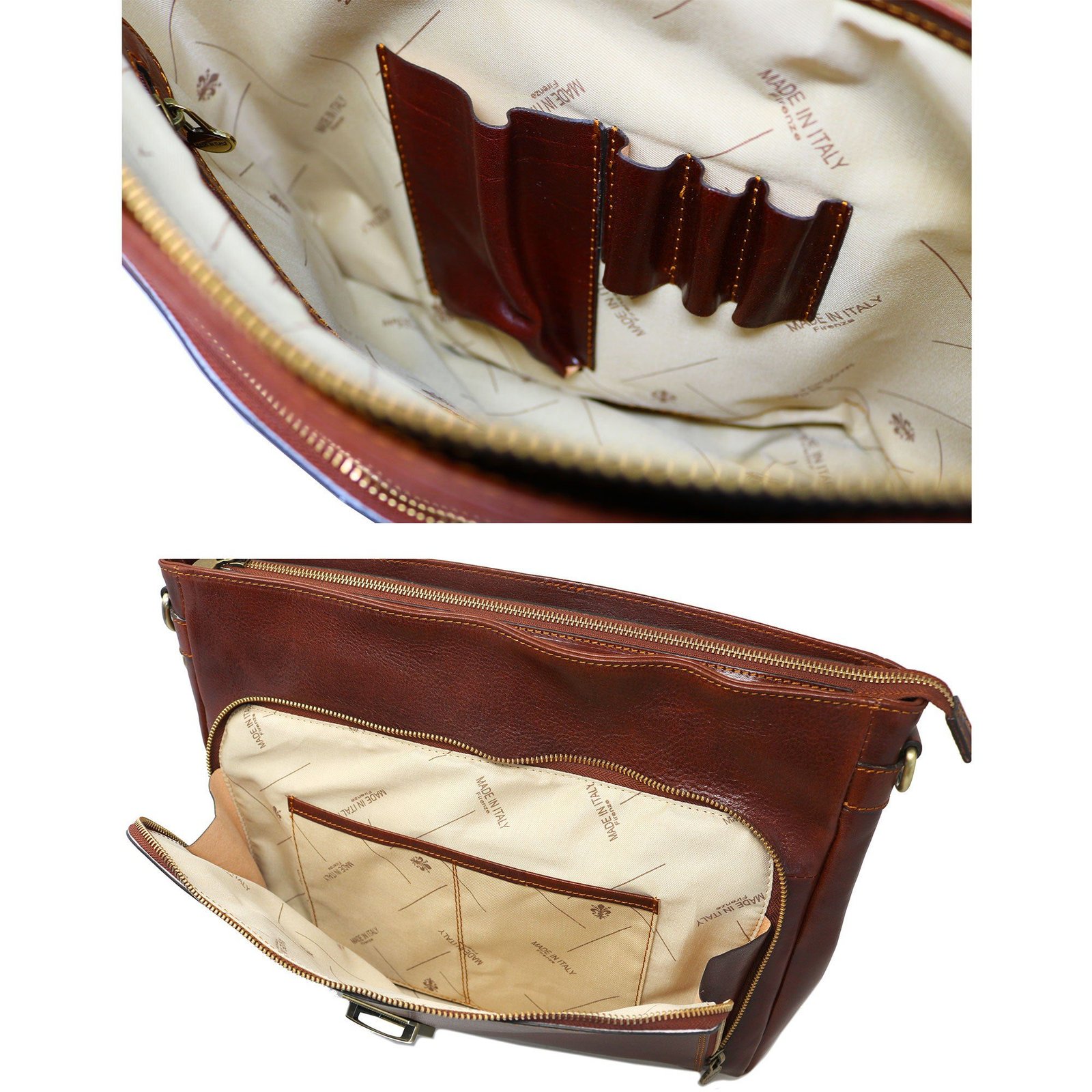 Certainly, there are many reasons this bag stands out today. First, it features a padded middle divider for protection. Second, it includes full-grain hand-stained Italian leather throughout. Third, the executive design suits corporate environments perfectly.